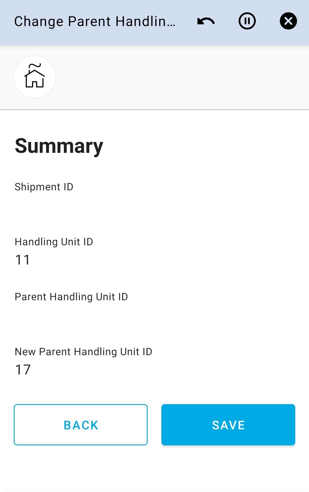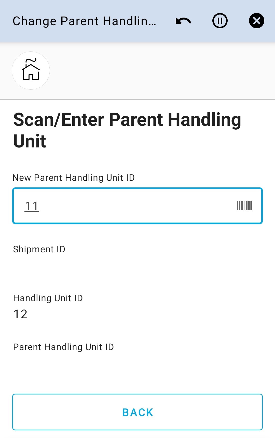 Change Parent Handling Unit app can be used to change the parent handling unit of a handling unit on the user’s default site. The handling unit can be either shipment connected or not connected.