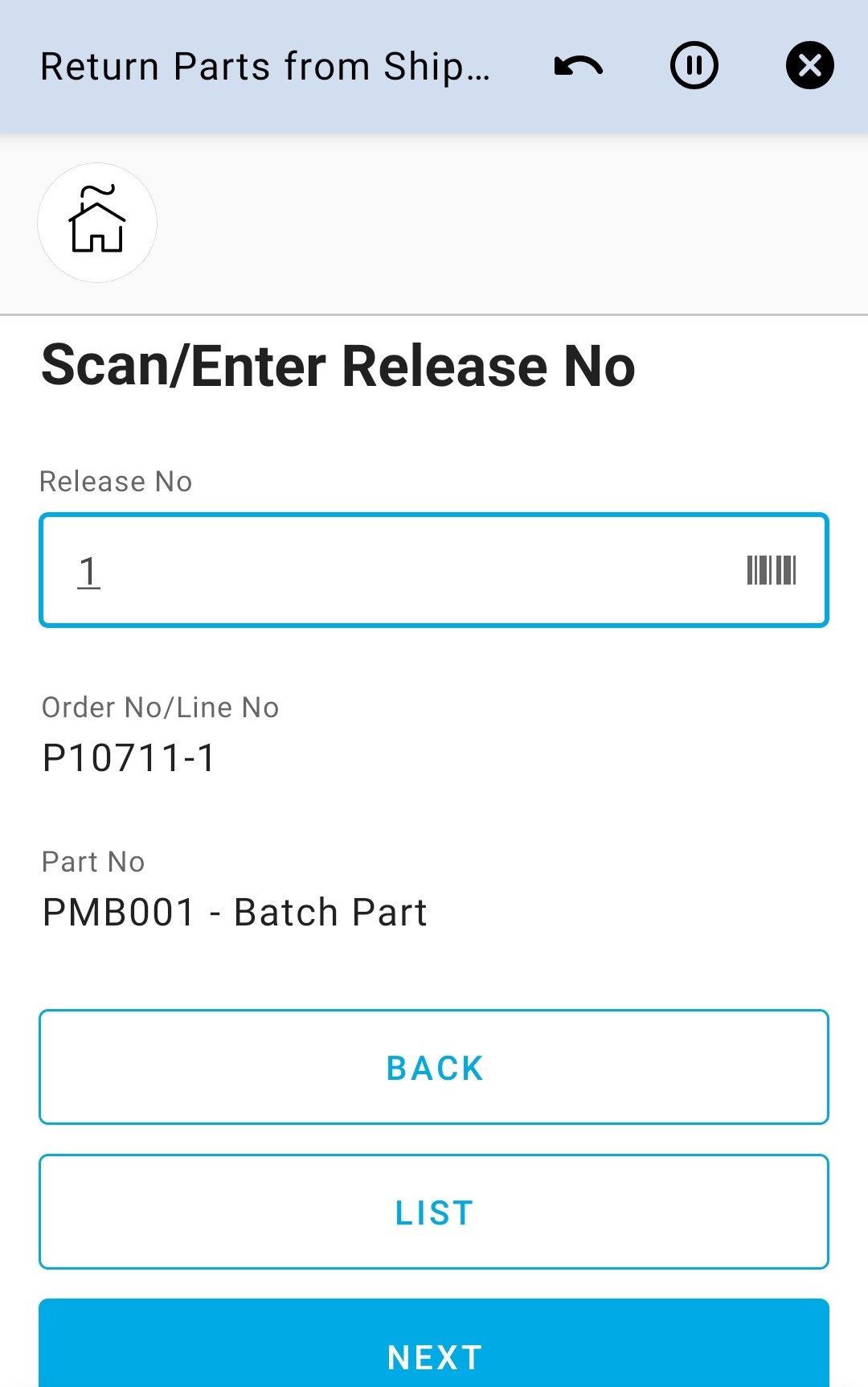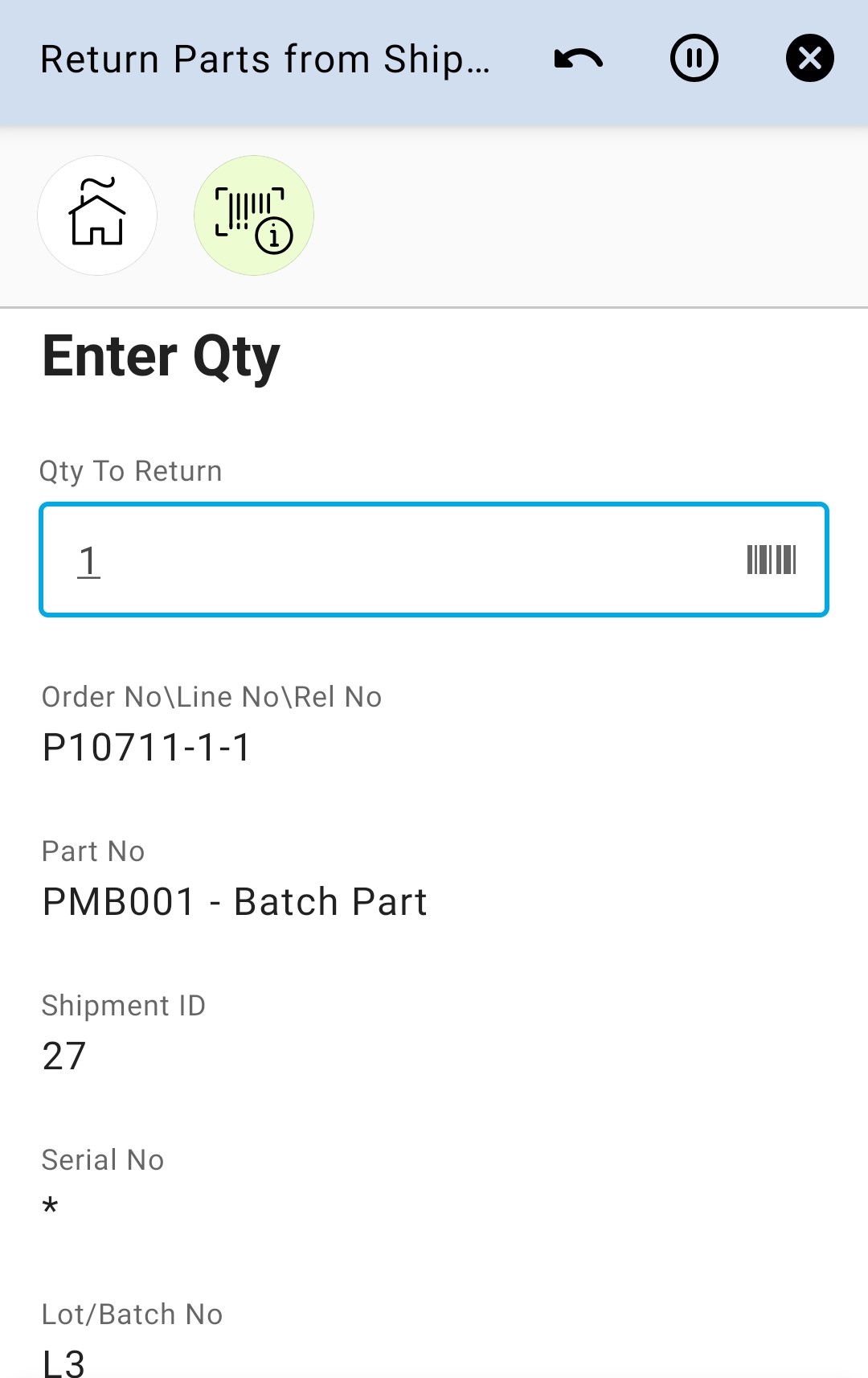 Return Parts from Shipment Inventory app can be used to return Parts from shipment inventory to regular stocks on the user’s default site.