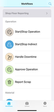 - Operation : Start/Stop operation for Setup/Production, Report Downtime, Report Indirect work, Approve Operations, Report Scrap